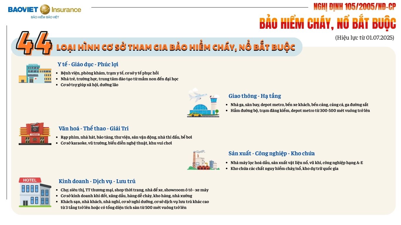 Theo quy định mới ban hành dựa trên Nghị định số 105/2025/NĐ-CP, từ 1/7/2025, nhiều cơ sở phải mua bảo hiểm cháy, nổ bắt buộc. Hãy cùng Bảo Việt Đà Nẵng kiểm tra xem doanh nghiệp của bạn có thuộc 44 cơ sở nằm trong diện bắt buộc mua Bảo Hiểm Cháy Nổ hay không, nhằm tránh các vi phạm không mong muốn.